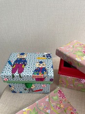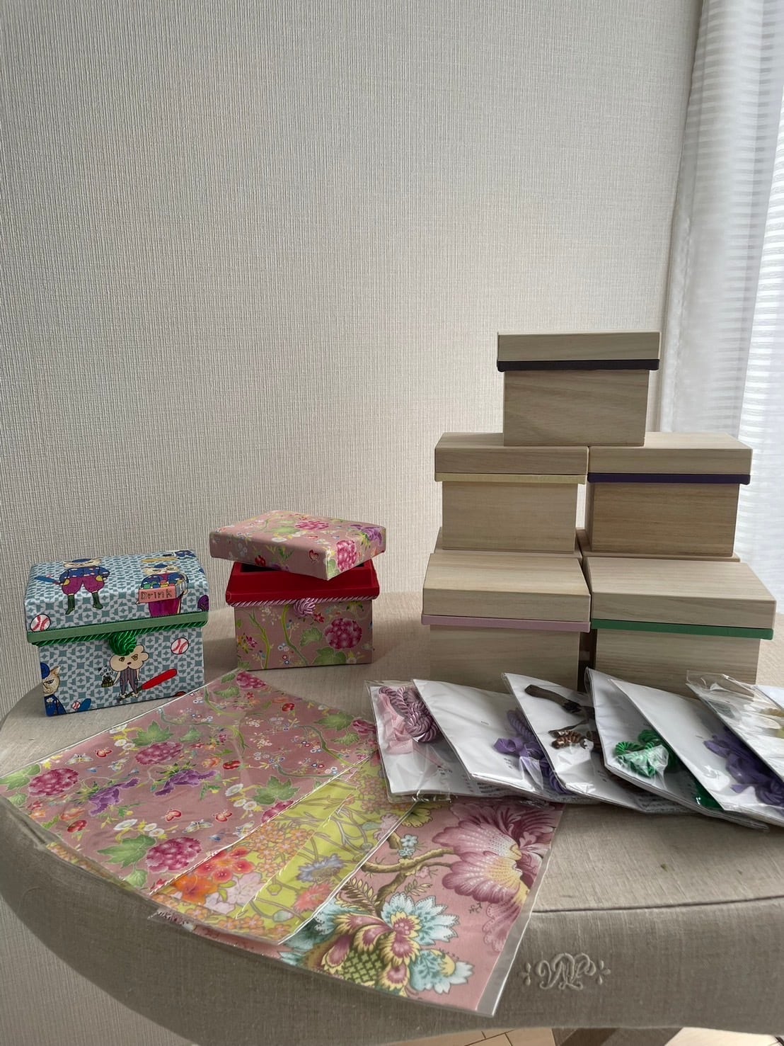 カルトナージュ手法を使って生地をはり可愛いオリジナルのミニ茶箱をつくります。